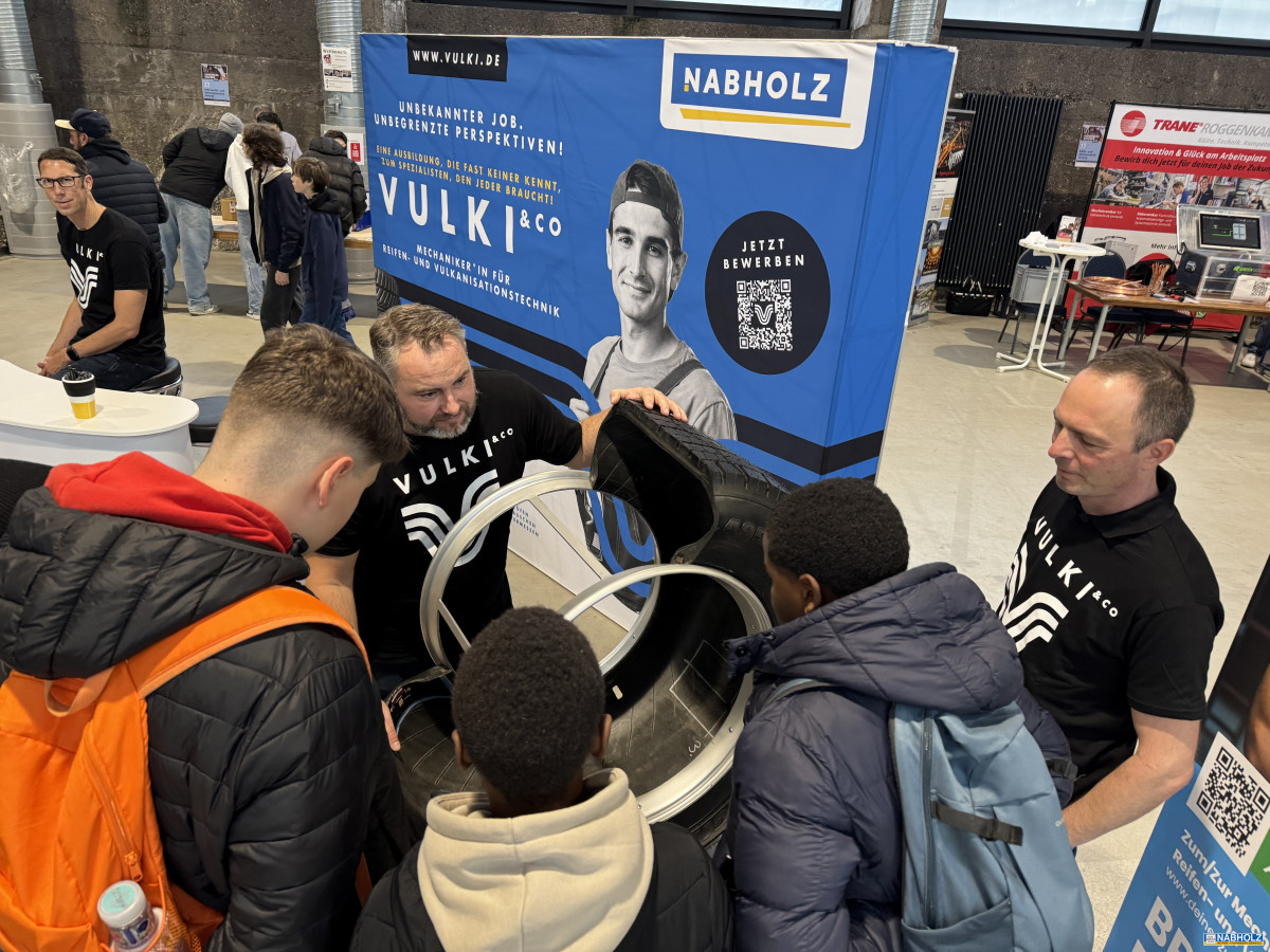 Am Stand standen Ausbildungsleiter Till Gerhardt und Vulkaniseurmeister Enrico Nielsch Rede und Antwort. Sie informierten über Ausbildungsinhalte, Perspektiven und Berufschancen im Reifen- und Vulkanisationsbereich, erklärten technische Abläufe und warben für den Einstieg bei Nabholz. Die Messebesucher konnten direkt Einblicke in die täglichen Herausforderungen und Möglichkeiten gewinnen – und mit Fragen einsteigen, die für ihre Berufswahl bedeutsam sind.